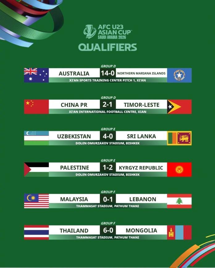 首轮比赛中,4个小组出现了10-0以上的大比分,包括中国队所在的D组,即澳大利亚U23队14-0北马里亚纳群岛U23队。另外,A组约旦U23队11-0击败不丹U23队,H组卡塔尔U23队13-0文莱U23队,I组阿联酋U23队13-0关岛U23队。这样,澳大利亚U23队就和约旦U23队、卡塔尔U23队、阿联酋U23队一起,各自领跑所在小组积分榜。同时位居小组第1的还有日本U23队、越南U23队、乌兹别克斯坦U23队、泰国U23队、伊拉克U23队、韩国U23队、塔吉克斯坦U23队。